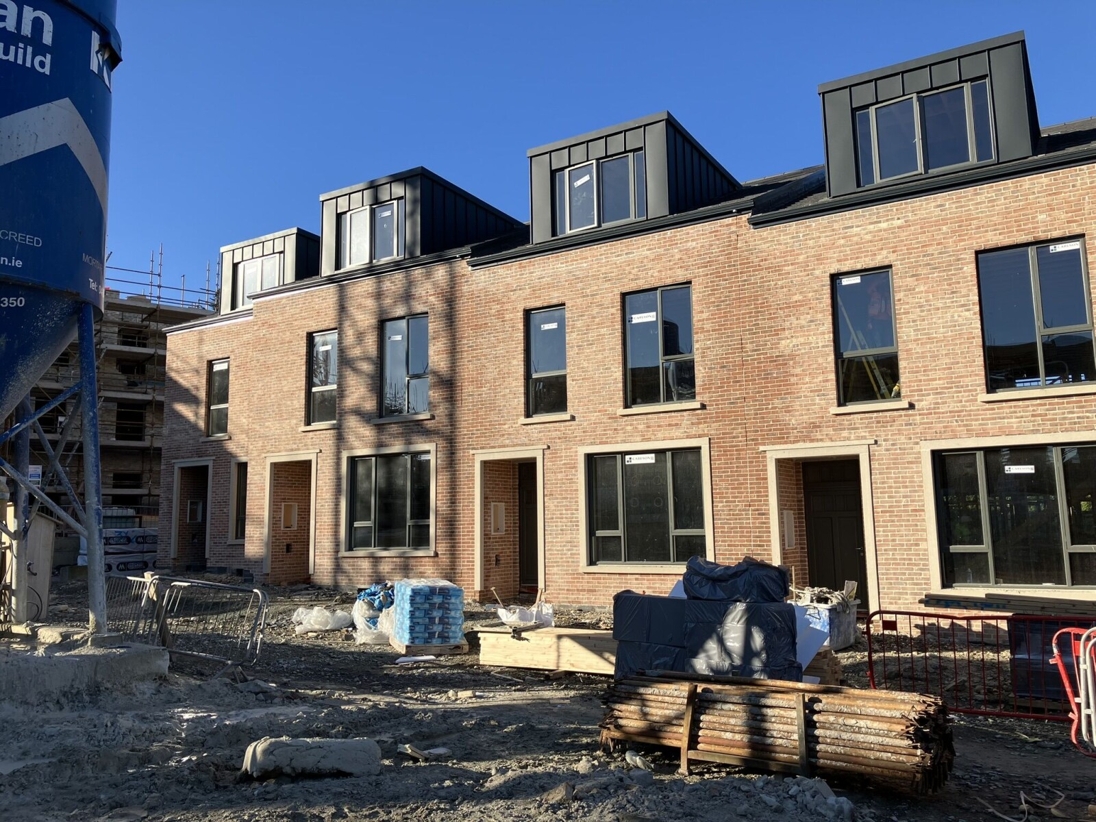 Construction works are nearing completion at this residential site at Barnhill, Dalkey Co. Dublin. Scaffolding for the 13 no. houses have now been removed with the civil drainage well progressed also. The apartment block consisting of 23 units constructed with load-bearing masonry and precast floors over an undercroft basement parking has now been topped out with façade installation almost complete.