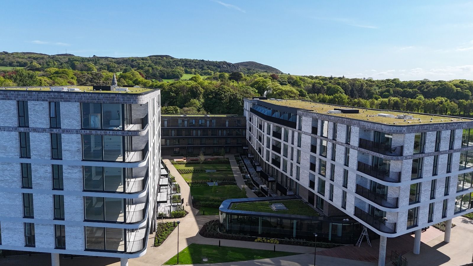 A terrace of three-storey plus attic duplex units fronts onto Howth Road, referencing the scale and rhythm of the local village streetscape. These units provide direct street access and form a continuous frontage along public parkland spaces, creating a defined threshold into the town and mediating between the taller blocks and surrounding context.