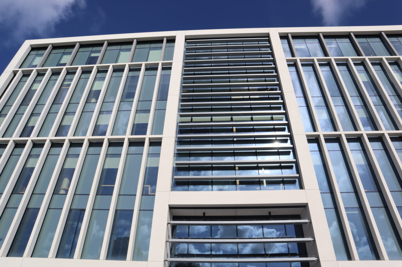The external facade of the building features a mixture of glazing and a decorative polished concrete frame which stands off the building superstructure.