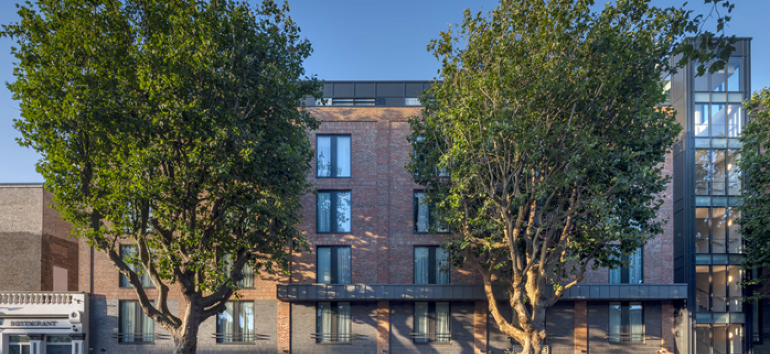 The Dublin One Hotel was opened in 2021. The project involved the restoration of The Big Tree pub which has opened separately to the hotel. The hotel draws on the character of the surrounding historical buildings. It adopts similar materials and window proportions. All windows are vertically proportioned. It is marked out as a modern public building in the adoption of curtain walling for the stairs and setback top storey. The regular layout of hotel rooms has facilitated the breaking up of the long elevation on to North Circular Road into bays. The vertical window proportions and bay width reflect the traditional fine grain development of Dublin. The scale of the building has been further sub-divided vertically by the introduction of a canopy at second floor level and the change of brick colour for the ground and first floor within the bays. This relates directly to the adjoining two storey development.